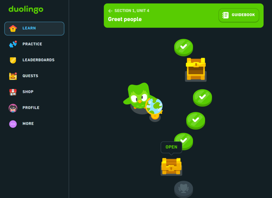 勉強方法は前回書いた通り、Duolingoをメインにすき間時間にちょこちょこ進めている形です。勉強を始めてから3週間ほど経ちますが、現在はUnit4の挨拶のセクションをやっているところです。